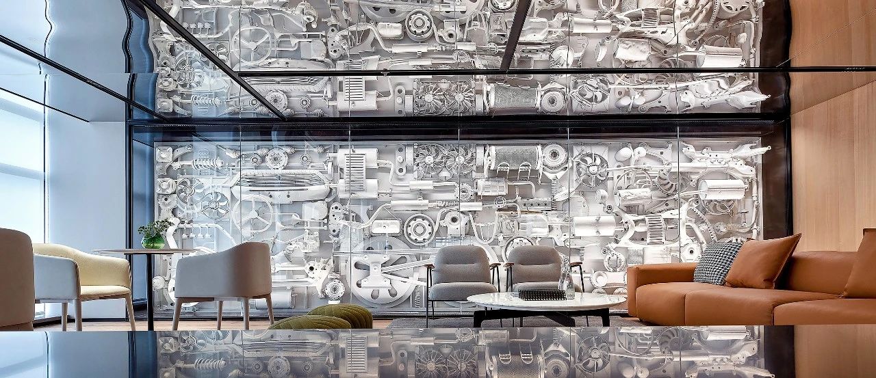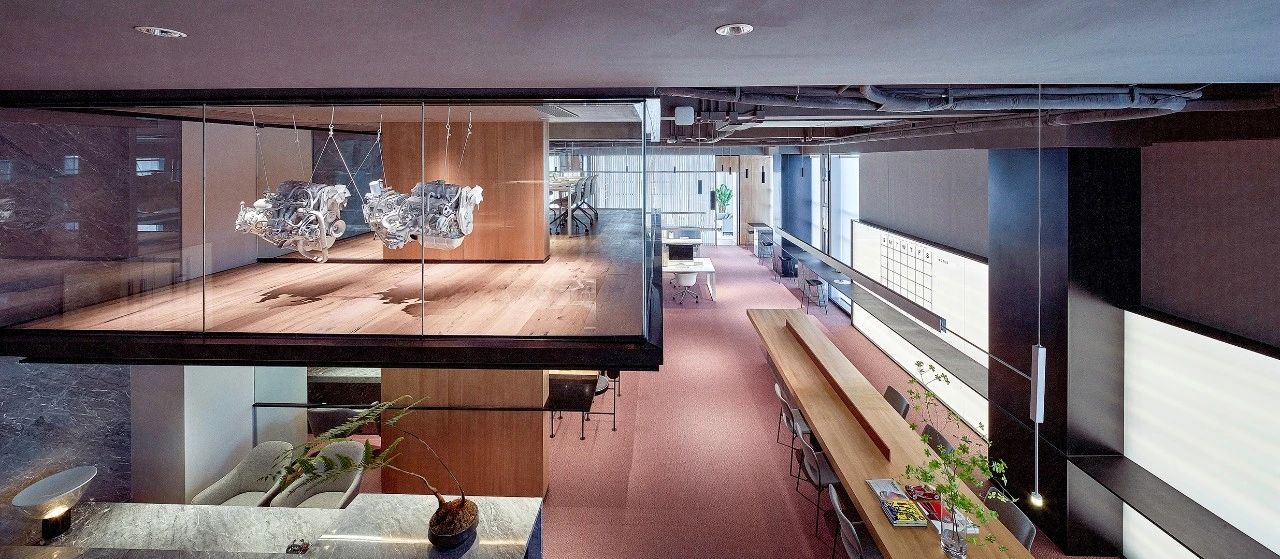而空间的软装上,我们也着重考虑了与园区风格的一致性,空间中的汽车零件装饰,来自于废旧汽车的回收零件,让空间多了几分趣味,又对空间进行了合理的分割,也是对当下可持续理念的实践。