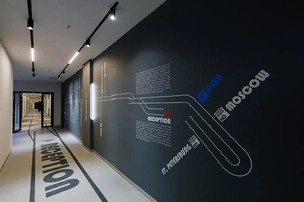 Tags:科技,老建筑改造、长廊、时尚简约黑白灰、文字图形设计、阶梯座。风格上的极简可以更好地诠释材质的细腻 前台区域是来访者对公司的第一印象从材料品质、工艺细节,到开放性的空间构形以设计艺术的和谐韵律,消减事物间的二元对立