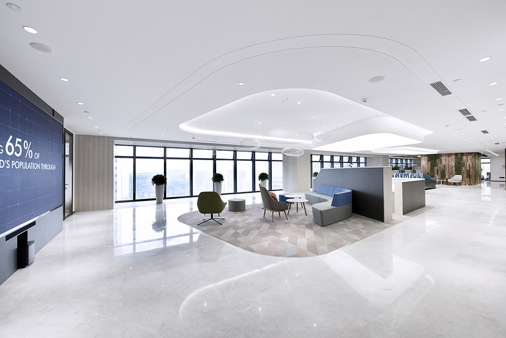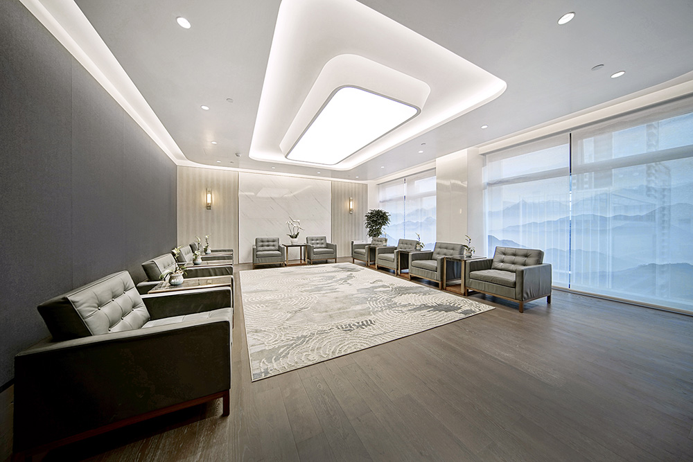 作为前厅,展现的不仅是企业的硬件形象,也是品牌的软实力象征。地面大面积是浅灰色的天然石材,通透而洁净。