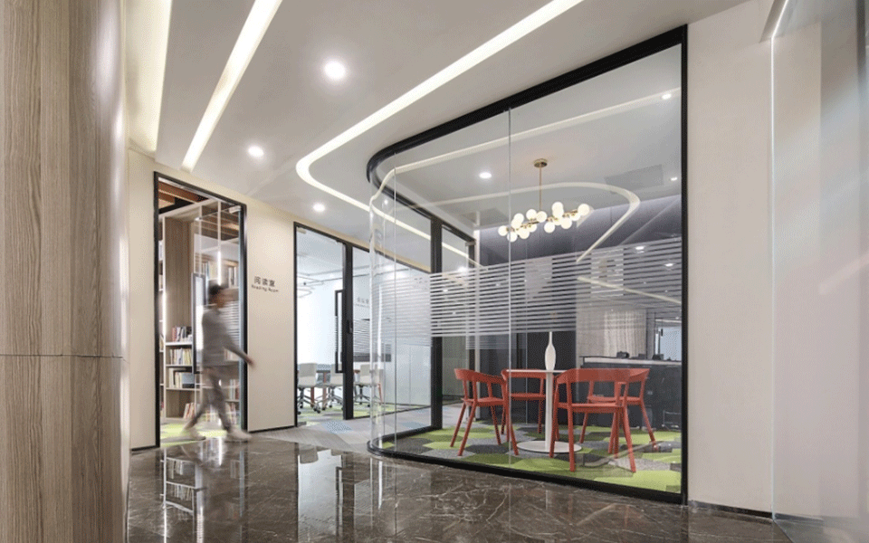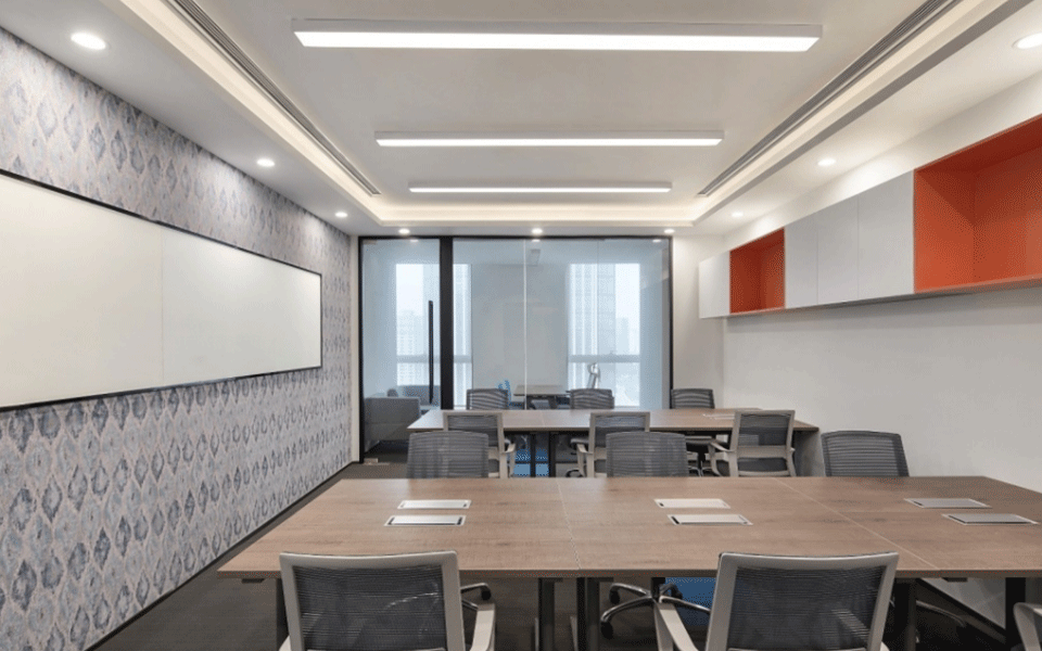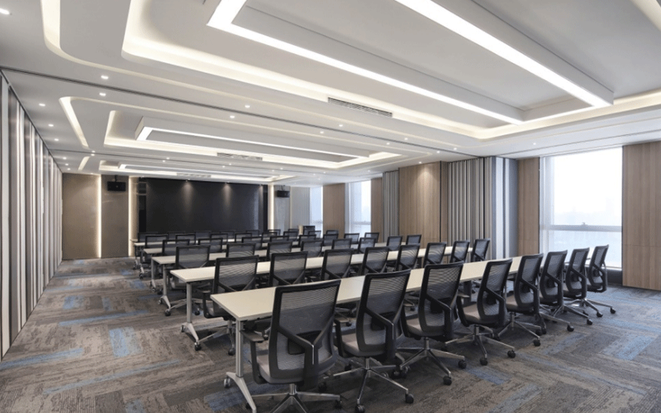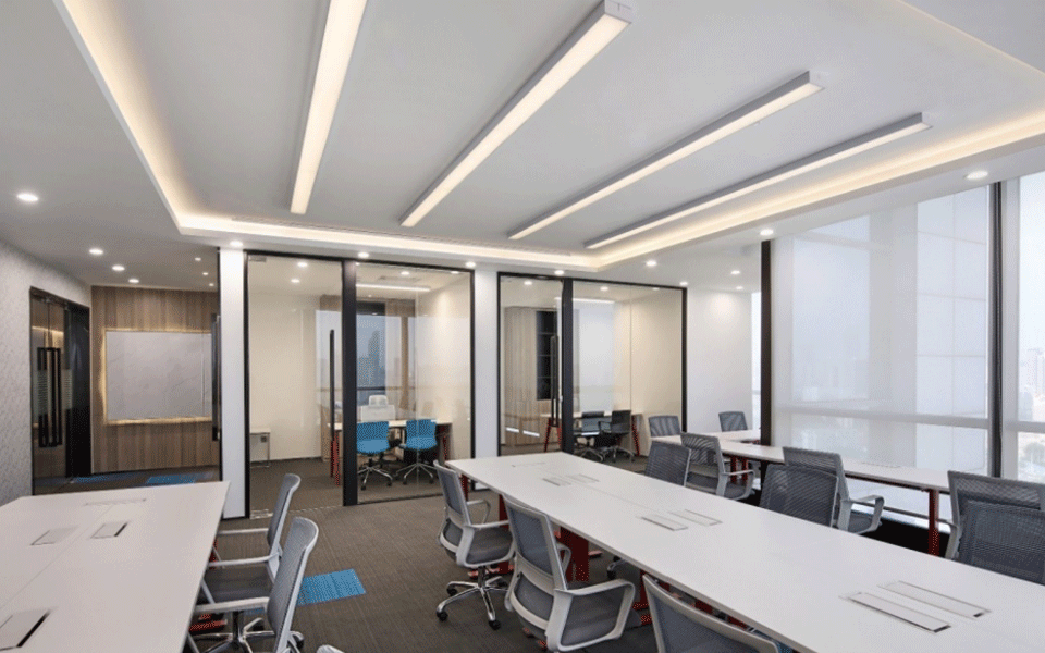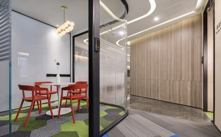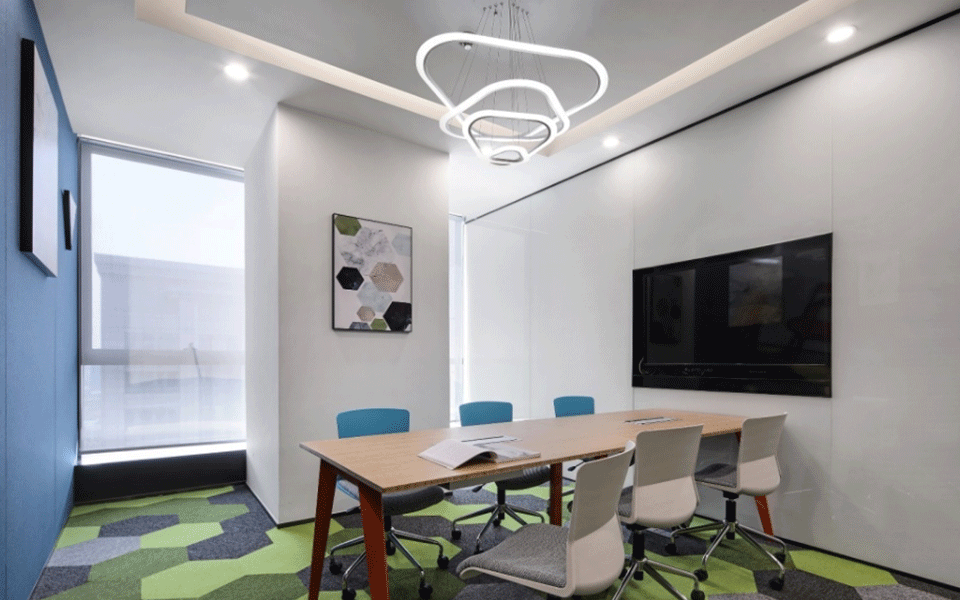会议室简洁、敞亮、通透,天花和墙板的设计强调线条的变化,二维的平面变化延伸到三维空间,观者对空间的感受力也被增强。