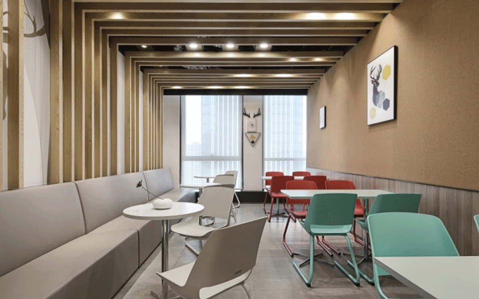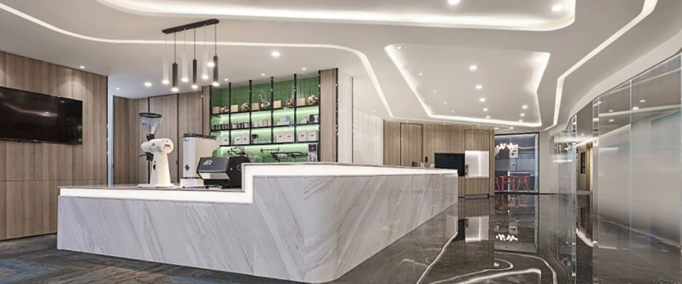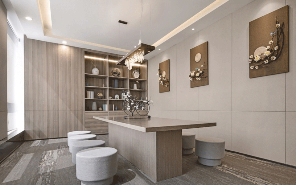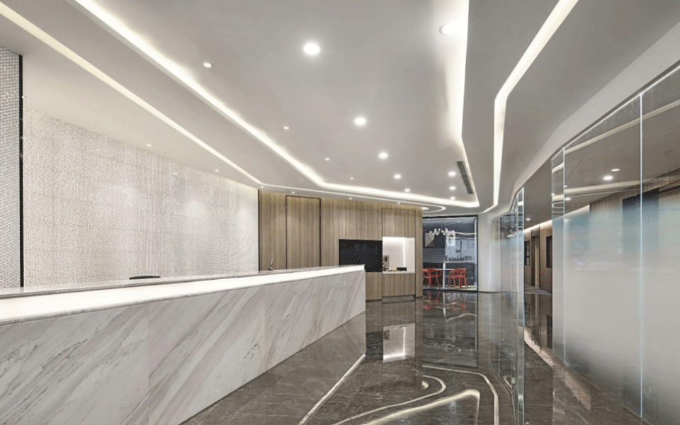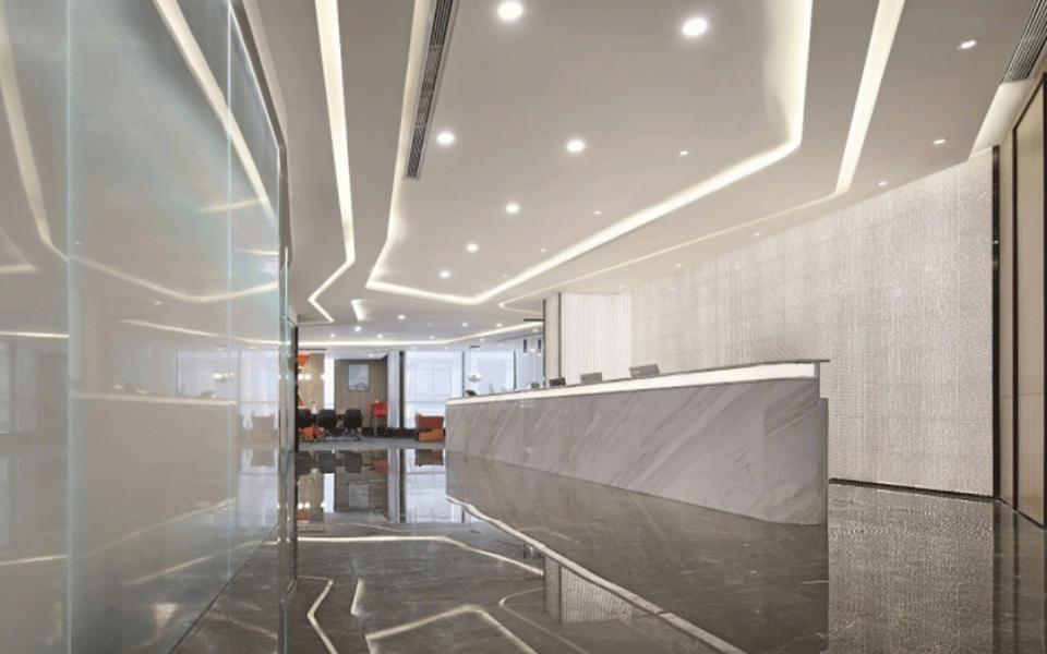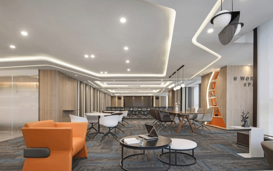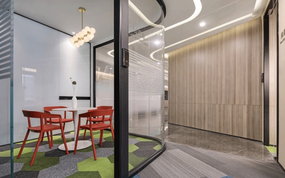 会议室简洁、敞亮、通透,天花和墙板的设计强调线条的变化,二维的平面变化延伸到三维空间,观者对空间的感受力也被增强。