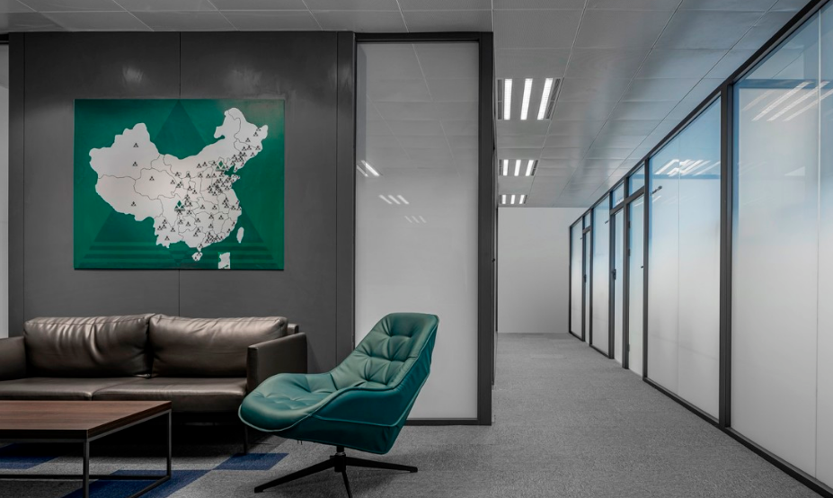 开启电梯来到企业的门厅区,运用半高式隔墙的手法通过两面独立的柜体墙将空间功能分区。灰色的背景墙将背后的自然光线阻隔,让近距离的视线感