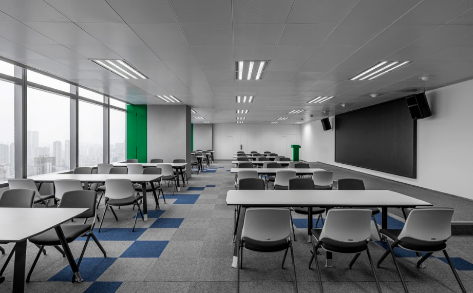 受沉浸稳重,两边透出的光线又让空间显得灵活通透。运用三角形和立方体的结构特点设计了吧台和墙面的构成元素,绿色作为企业的主色调贯穿始终。