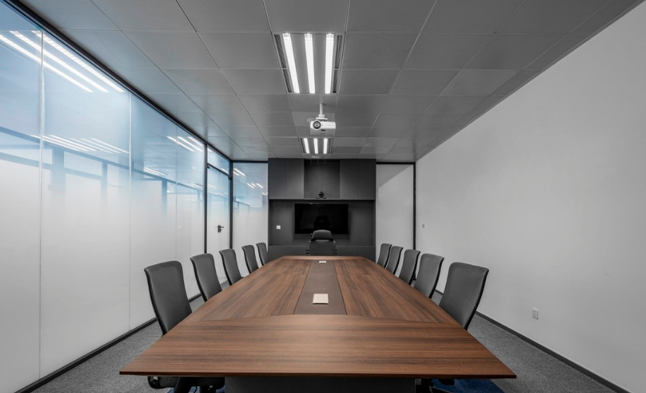 干净整洁的会议空间以白色为主,正面灰色的柜子将电视、远程会议以及音控系统等功能全部解决。