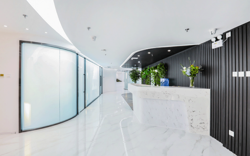 设计师以科技元素串联整体设计思路,黑与白相融合,用雾化玻璃打通内部建筑结构,与大会议室的自然采光互动,成为空间动线的两点。