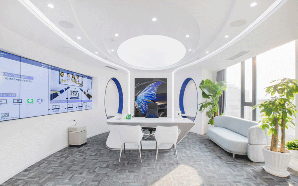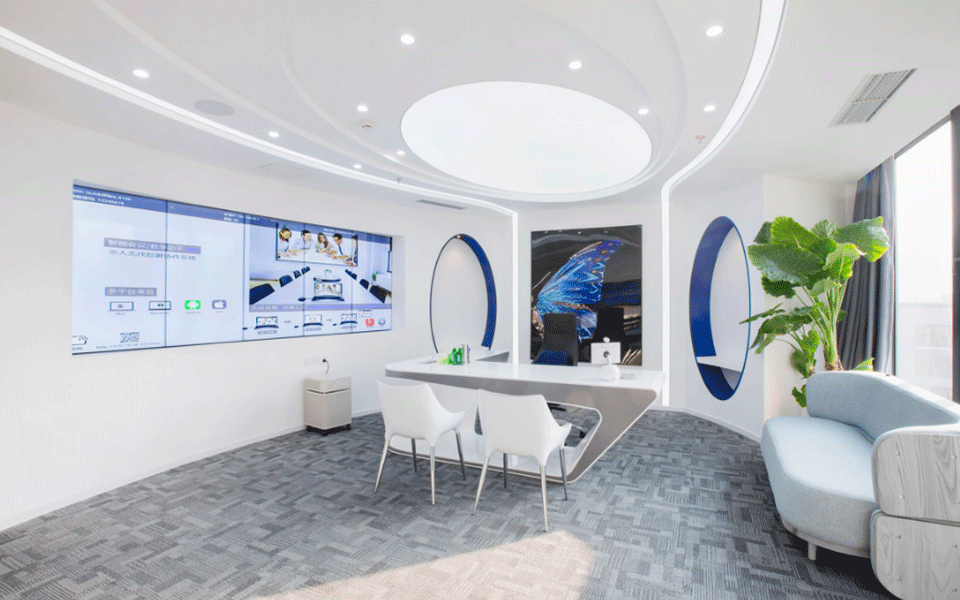 设计师的独到构思,推翻了传统观念中的”科技即冰冷“的认知,采用飞碟形状的顶面造型,运用软膜天花,与自然相融合。