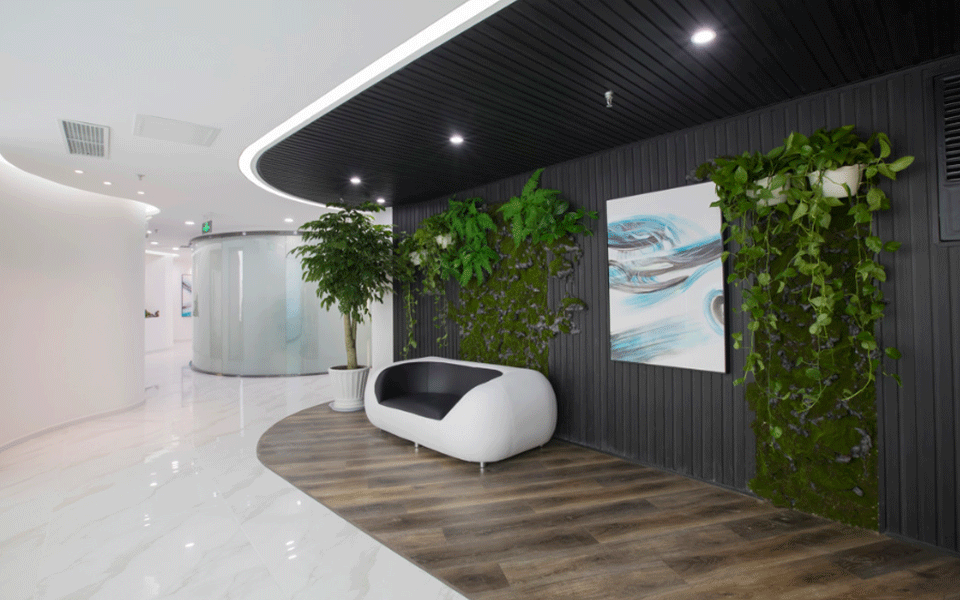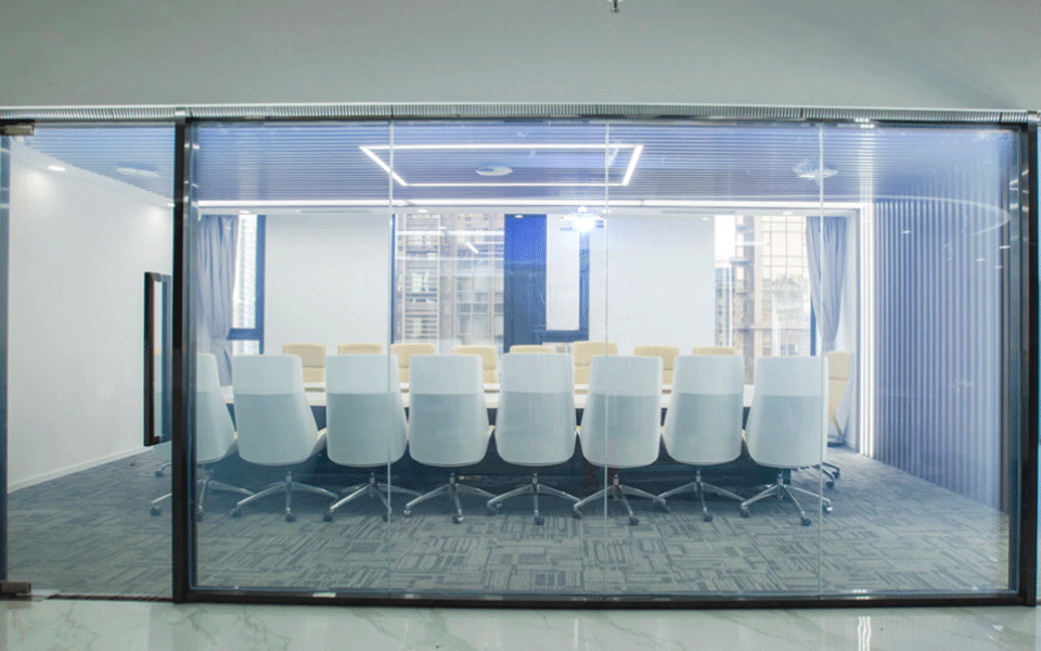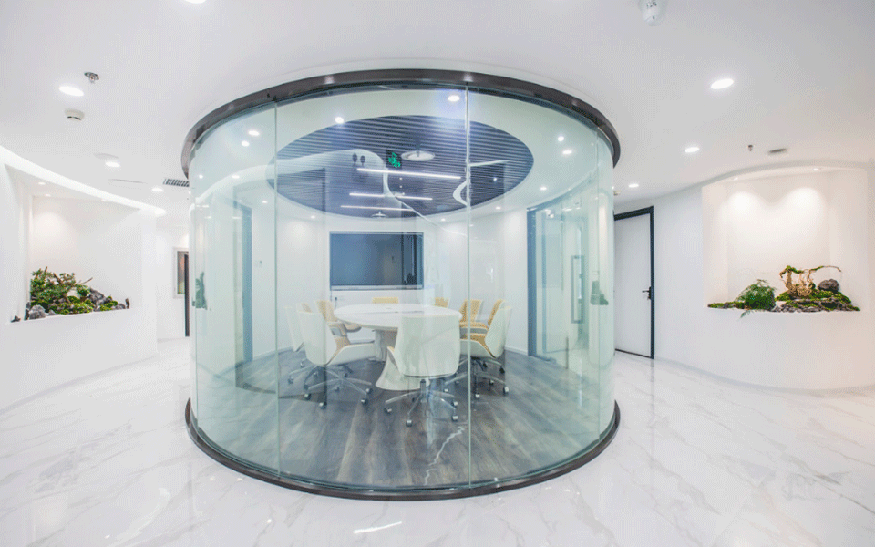 拥有"舱体“概念的会议室,选用通电雾化玻璃作为全包式墙壁,两侧微景观环绕,实现真正的花园式办公。