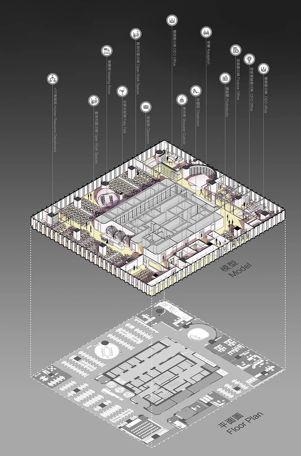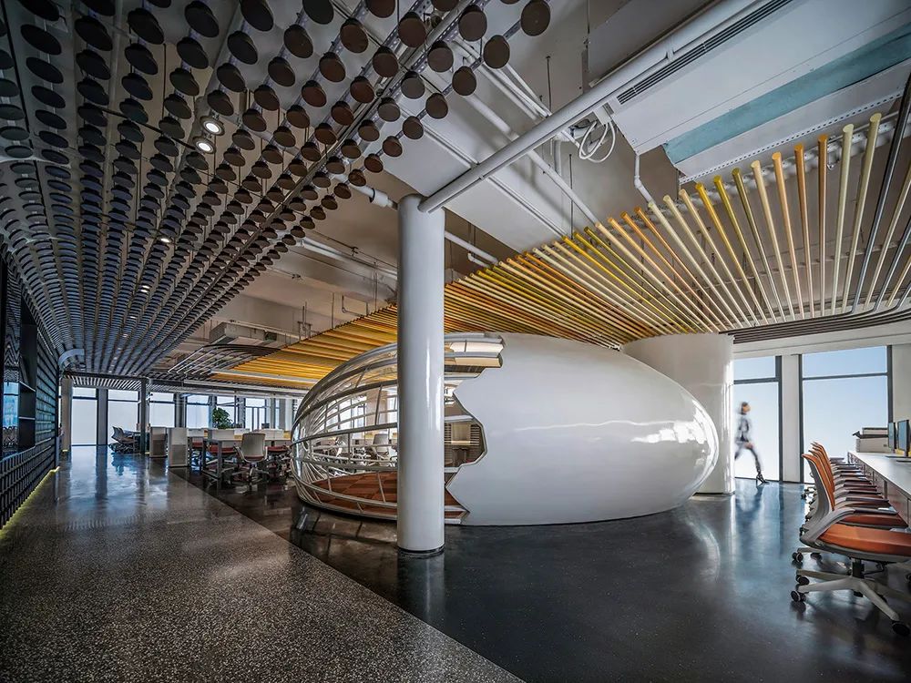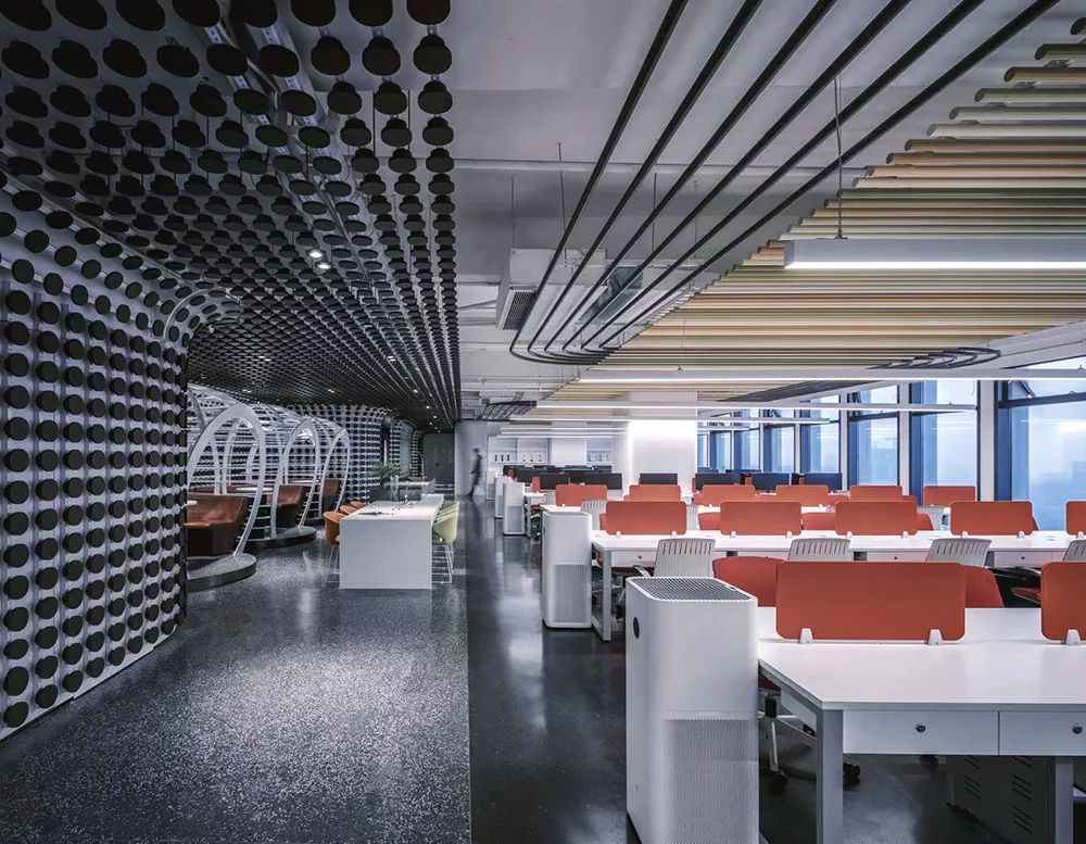 整个办公空间秉持着开放性、互动性的原则。将整个空间打通,采用大开放式的办公环境,仅用一些隔断形成分区,空间顶部的装饰,提供了空间分区的线索,针对