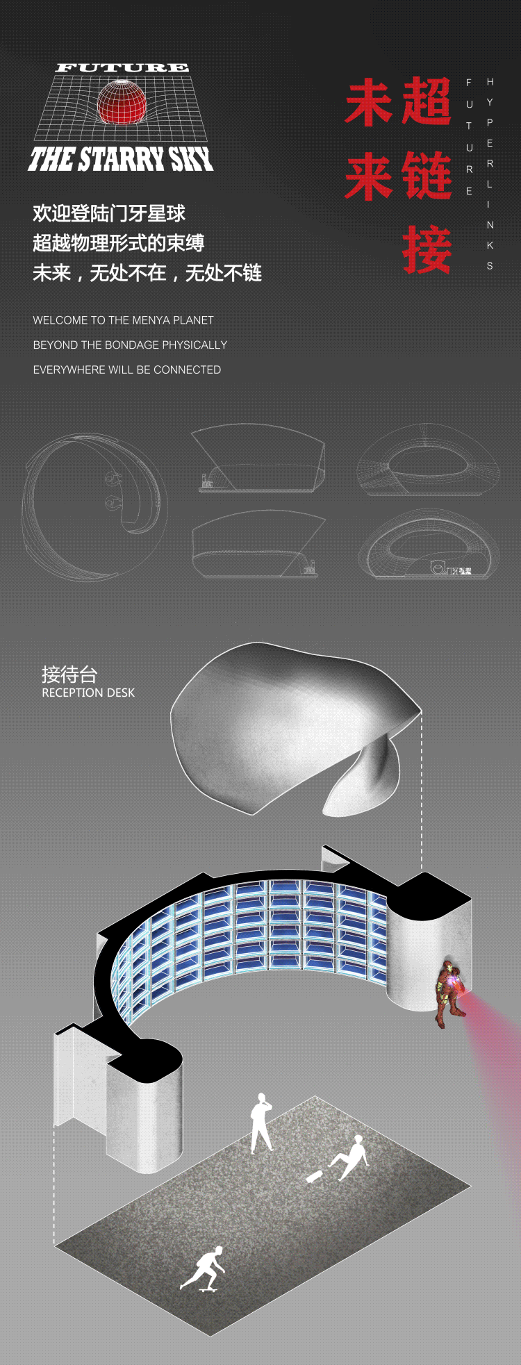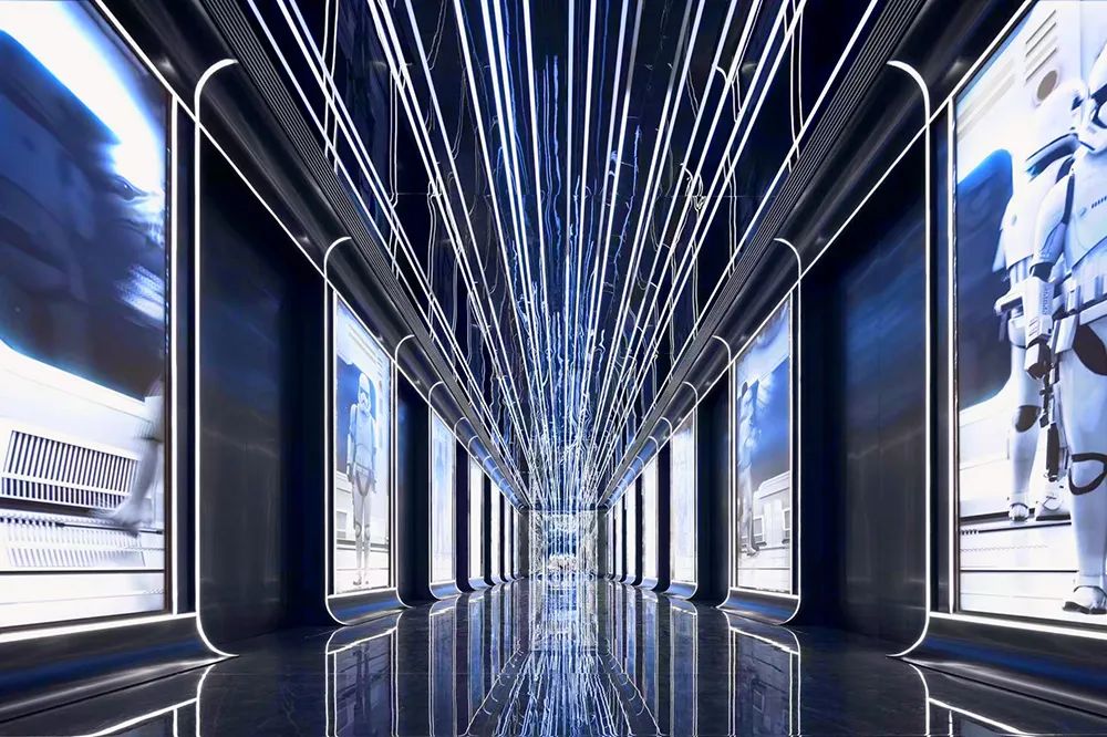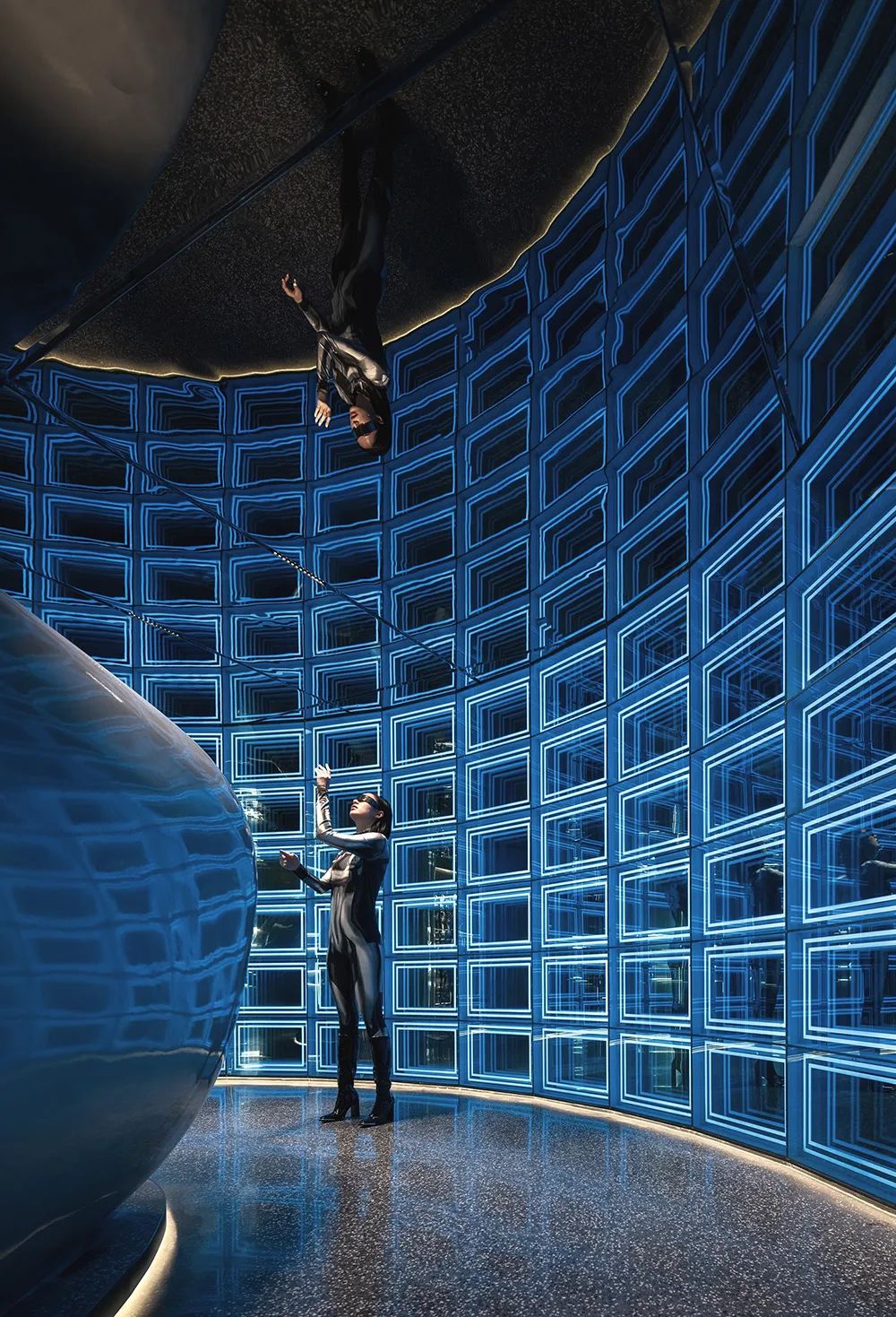 参观者仿佛被投射到一个浸入式环境中,空间所构建的世界观和未来逐一出现在面前。用流动的材质围合出如同舱体的接待台,材质的对比,在光影的催化下交错,未来,无处不在。