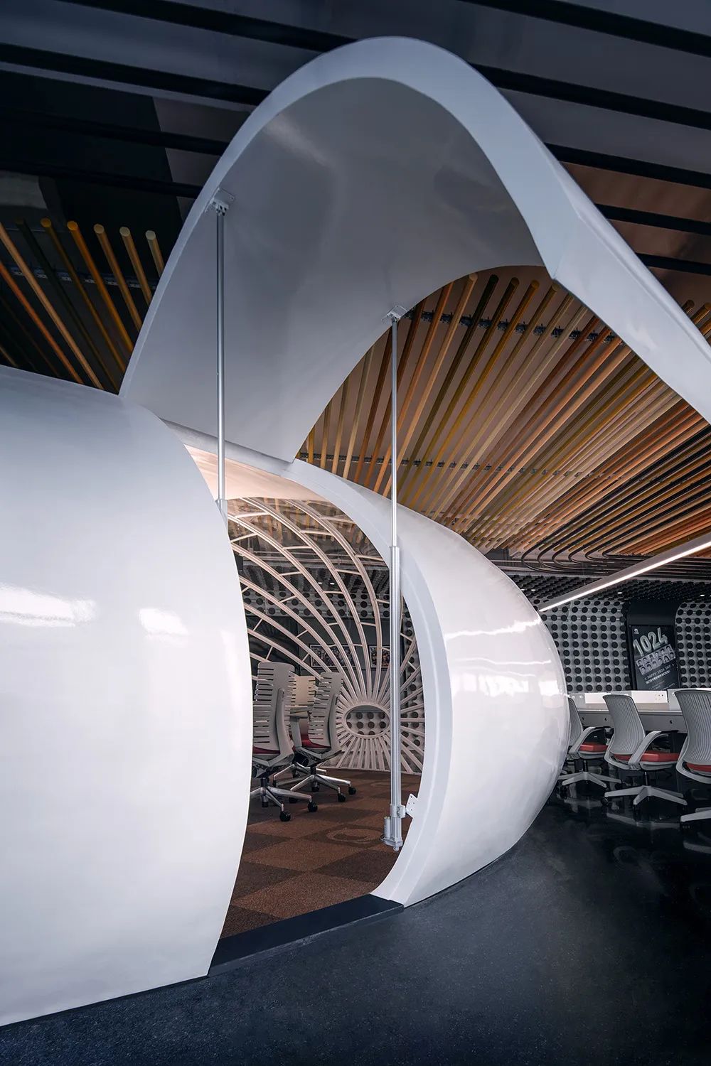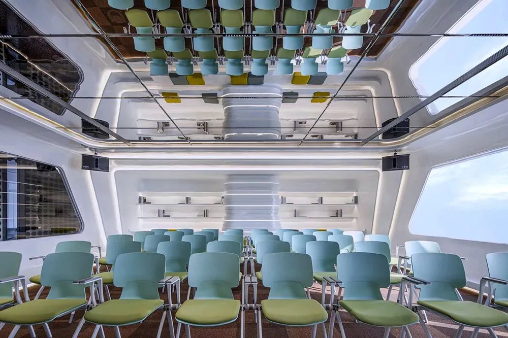 培训室的设计也采用了飞行舱的灵感,不规则的窗型,空间的线条也循此递进。每一处细节背后,都潜藏着设计关于人与空间关系的探索。人们在不同区域内行走时,也在与空间发生对话。这些巧妙的设计,贯穿了整个场所。