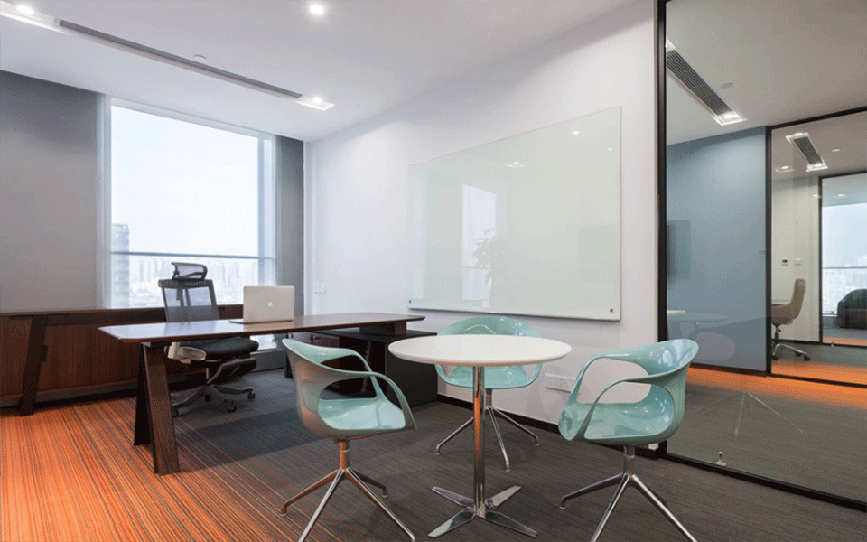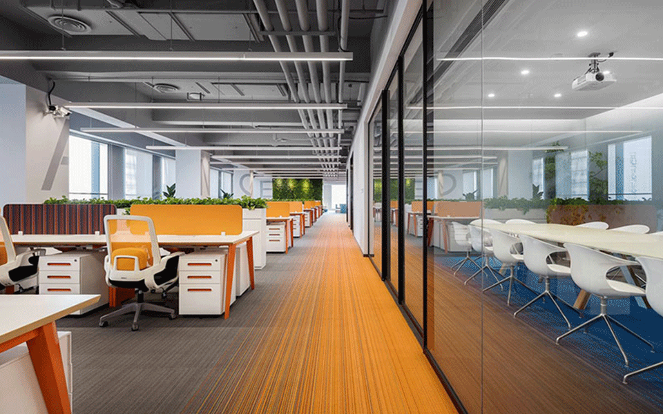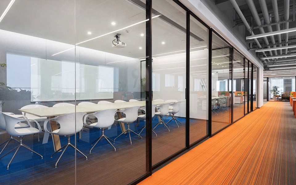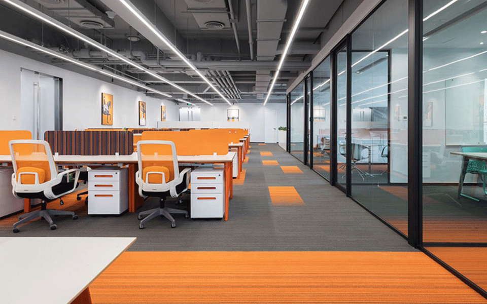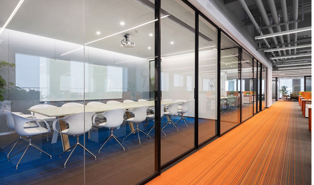 在办公区域的设计中设计师大胆的将走廊的地毯做成橙色,这不仅与办公桌面的挡板、座椅相呼应,又和玻璃里面的会议室的地毯做成渐变色,让原本明确的