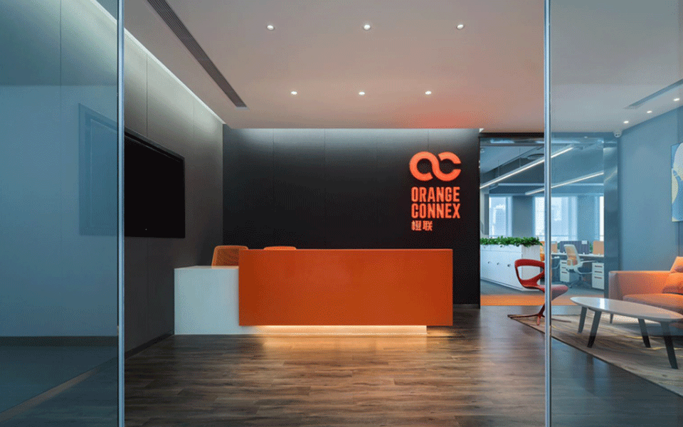 整个前台区域以灰黑色调为主,橙色logo、沙发、前台嵌入其中,再点缀上少许白色和红色。管中窥豹,整个空间的剪影就跃然纸上,就好像某位作家在写一