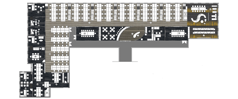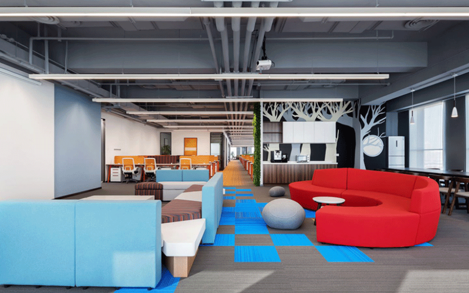 在本案的色彩搭配上设计师将主色调定位成灰白色,用橙色为主的暖色调点缀其中,让整个办公空间多了一丝活力。在办公区域走廊地毯上的独具匠心,又体现了设计师对于空间设计上的巧思。